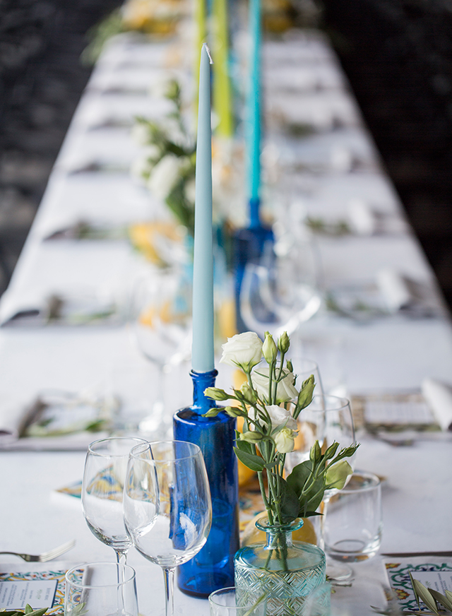 I love how we used the Sorrento pastel ceramics watercolors and incorporated them into almost every element of the decoration. From the menu design, to the colour selection of the glass bottles, candle colours, cocktail napkins, touch of olive branches, selection and colours of flowers, scent of lemons. It was truly everything the bride was dreaming of.